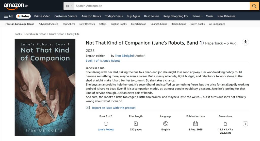 Progress has been slow this last year. Book one in Jane and her robots series is close to ready for publication but awaits completion of the second book. Book two first draft is at 30k words (goal is around 60-70k).